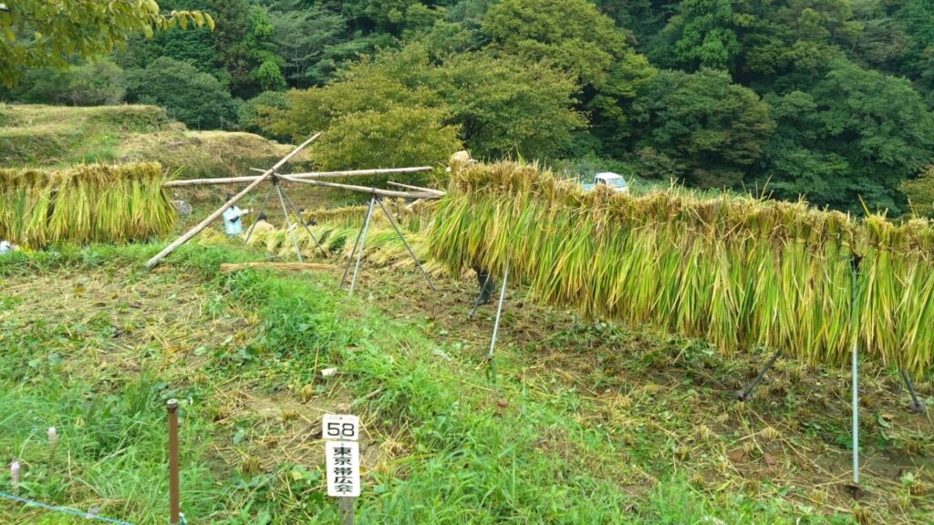 今年で3年目の稲刈りですが、稲束を結束する作業は難しく地元の応援団の方の協力を得て何とか終了し、美味しいお米となりますようにとハゼかけにつるして今年の作業を終えました。